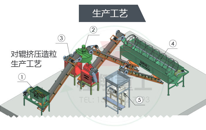 對輥擠壓造粒機生產(chǎn)線每年可加工2萬噸的硫酸鉀復合肥料,該復合肥生產(chǎn)線主要設備有:對輥擠壓造粒機、盤式喂料機、滾筒篩分機以及臥式攪拌機、自動包裝秤等。