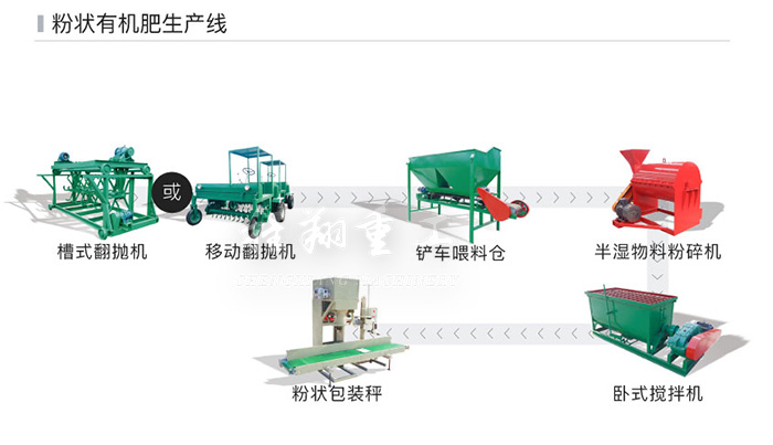 小型的粉狀有機肥生產(chǎn)線,適合剛起步的、資金不足的企業(yè)。生產(chǎn)能力不足的,或者資金不夠的廠家可以直接發(fā)酵腐熟之后粉碎即可作為粉狀有機肥料使用,包裝是為了順應環(huán)保生產(chǎn)的要求,運輸途中避免粉塵污染以及不必要的損失。下圖為年產(chǎn)2000~5000噸的豬糞有機肥生產(chǎn)線,主要包括發(fā)酵、粉碎、包裝三個環(huán)節(jié),其余的生產(chǎn)設(shè)備都只是為了提高生產(chǎn)線的自動化程度以及增加有機肥料的營養(yǎng)含量,可根據(jù)客戶需要進行刪改。
