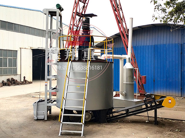將待發(fā)酵的物料投放到進(jìn)料提升斗內(nèi),通過電動(dòng)提升裝置將物料送進(jìn)發(fā)酵罐中,在投放物料的同時(shí),啟動(dòng)主電機(jī),通過電機(jī)減速機(jī)帶動(dòng)主軸開始攪拌。同時(shí)攪拌軸上所帶的螺旋葉片帶動(dòng)物料翻轉(zhuǎn),使物料與空氣充分接觸,在攪拌的同時(shí),通過高壓羅茨風(fēng)機(jī)不斷打入空氣,在發(fā)酵罐底部上端設(shè)計(jì)有曝氣管道,對(duì)通過的氣體進(jìn)行加熱,使待發(fā)酵物料開始進(jìn)行有氧發(fā)酵階段。在加熱的同時(shí)通過溫度傳感器對(duì)罐體的溫度進(jìn)行調(diào)控,將發(fā)酵罐的溫度控制在發(fā)酵所需的最佳狀態(tài)。在物料發(fā)酵完畢后,通過出料口排出罐體,進(jìn)行下一步加工處理。