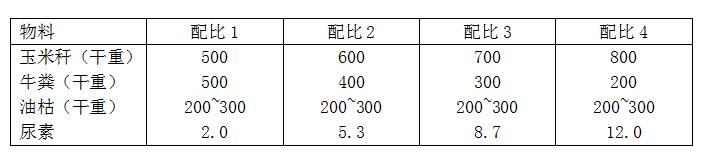 主要選擇資源豐富的軟質(zhì)作物秸稈和畜禽糞便為主,將物料的C/N比值盡可能調(diào)節(jié)到25:1。根據(jù)各地原料的差異,選擇下表中所列物料配比中的一種(其他秸稈和畜禽糞便可參照該比例)。油枯應(yīng)發(fā)酵結(jié)束前10 d左右按比例添加,均勻鋪在發(fā)酵堆上,通過利用臥式粉碎機(jī)將油枯與其他物料攪拌均勻,使用槽式翻堆機(jī)再堆制發(fā)酵。若加入油枯后堆溫超過60℃,應(yīng)即時(shí)翻堆,防止油枯炭化和氨化。