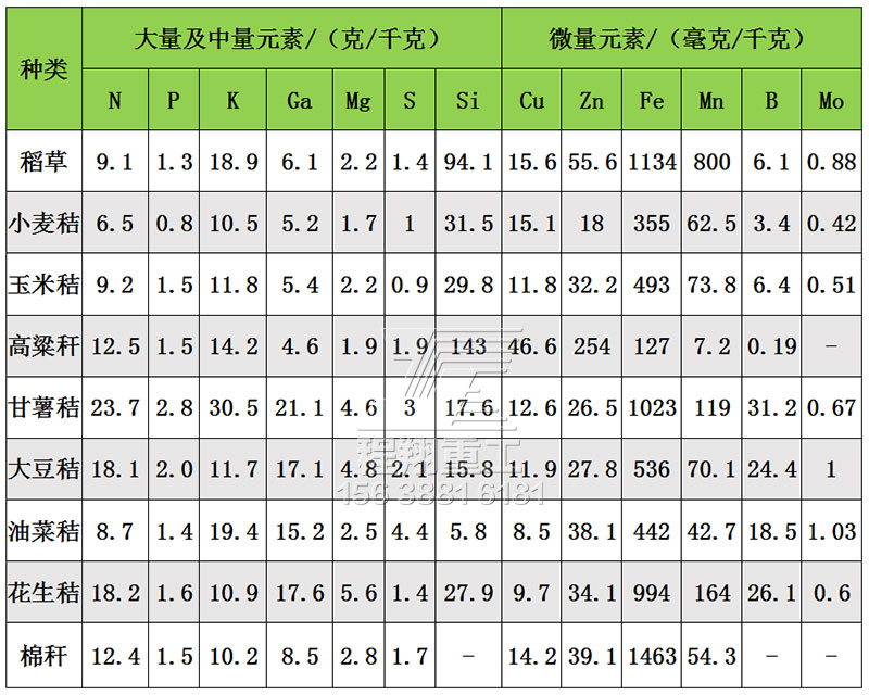 秸稈中含有大量的有機(jī)質(zhì)和氮(N)、磷(P)、鉀(K)、鈣(Ca)、鎂(Mg)、硫(S)、硅(Si)、銅(Cu)、錳(Mn)、鋅(Zn)、鐵(Fe)、鉬(Mo)等營(yíng)養(yǎng)元素,主要作物秸稈的營(yíng)養(yǎng)元素含量見表1。