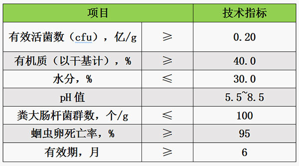生物有機(jī)肥產(chǎn)品的各項(xiàng)技術(shù)指標(biāo)應(yīng)符合圖1的要求,產(chǎn)品劑型包括粉劑和顆粒兩種。