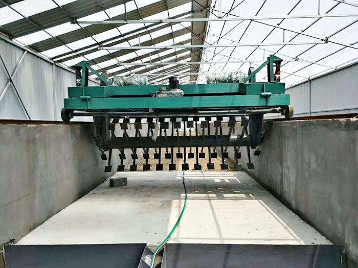 ③優(yōu)缺點:行走式翻堆機采用翻拋齒旋轉(zhuǎn)的翻堆結(jié)構(gòu)與自動行走系統(tǒng),翻堆時可根據(jù)料堆的深度進行升降,因此翻堆徹底,效率高,翻堆和輸送同時完成,機器邊行走邊翻堆自動完成全部工作過程,實現(xiàn)流水式有機肥生產(chǎn)。翻堆期間可以使用行走式翻動翻堆機,受天氣影響小、占地面積小、周期短、節(jié)省人力,一機多槽使用,處理能力強,操作簡單自動化生產(chǎn),設(shè)備投資成本也相對較低。缺點是攪拌機與堆料接觸部分高速旋轉(zhuǎn)易磨損,且與糞便混合物直接接觸容易被腐蝕,需要進行維護和更換。